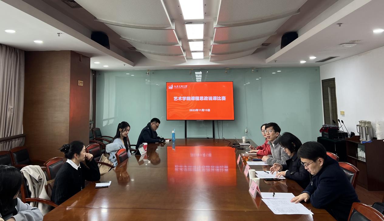 2023/11/14艺术学院举行2023年度课程思政说课比赛为全面落实立德树人根本任务,进一步发挥课堂教学的育人主渠道作用,把思想政治教育贯穿人才培养体系,艺术学院于2023年11月13日下午在定淮门校区第三会议室举行了课程思政说课比赛。本次比赛邀请南京市职教教研室正高级思政教研员胡卫芳、商学院副院长徐永兵、艺术学院副院长王铮担任评委,艺术学院院长黄一斓、各位系主任... -