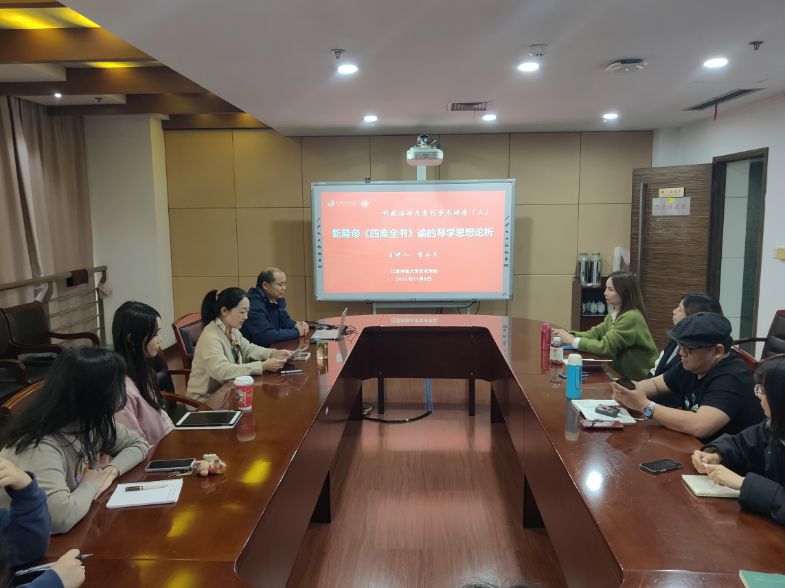2023/11/13艺术学院举办“科技活动月”系列学术讲座第三讲11月9日下午,艺术学院在定淮门校区综合楼二楼第一会议室举办了“科技活动月系列学术讲座”的第三场讲座,邀请南京艺术学院学报副主编、江苏省“333工程”培养人选李小戈副教授做题为“乾隆帝《四库全书》谕的琴学思想论析”的学术讲座。此次讲座由艺术学院院长、党总支副书记黄一斓教授主持,戏曲艺术系全体教师参加讲座。... -