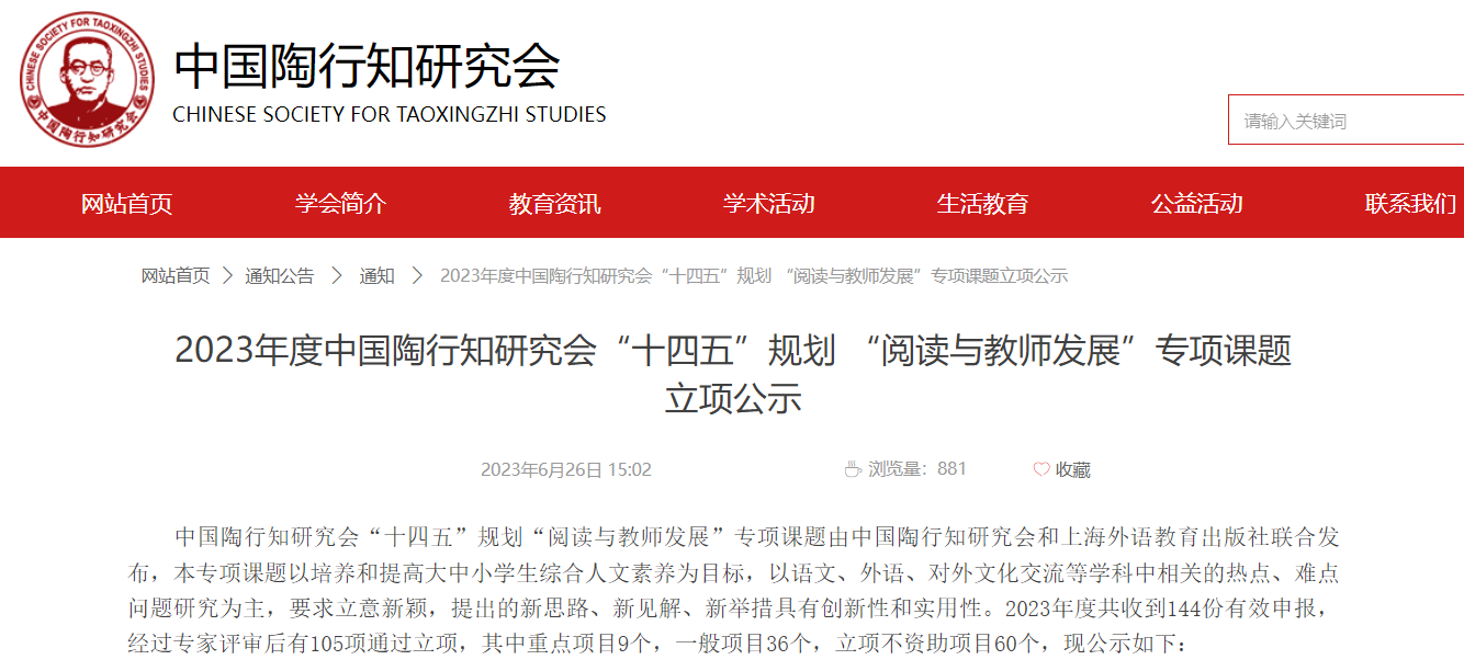 2023/06/30艺术学院获批中国陶行知研究会“十四五”规划“阅读与教师发展”专项课题立项6月26日,2023年度中国陶行知研究会“十四五”规划“阅读与教师发展”专项课题立项名单公示,艺术学 -