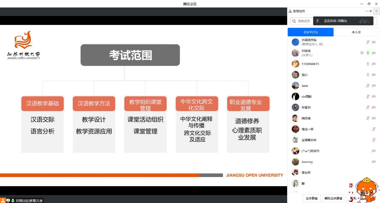 2023/06/20外国语学院为开放学生举办《国际中文教师证书》专题讲座为帮助开放学生进一步了解《国际中文教师证书》的意义、作用,指导学生备考,6月19日晚,外国语学院汉语