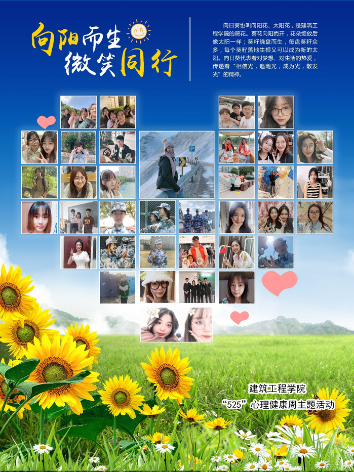 2023/05/29向阳而生,微笑同行 ——建筑工程学院开展525心理健康周活动捕捉真挚笑脸,记录和谐校园。为展现建筑工程学院师生温暖乐观、积极向上的精神风貌,提升师生幸福指数。5 -