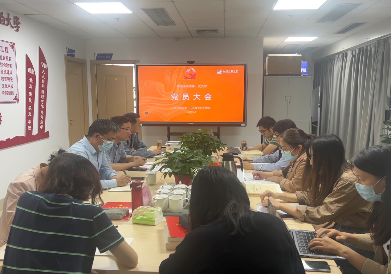 2023/05/25外国语学院第一党支部召开党员大会5月23日下午,外国语学院第一党支部全体党员在定淮门校区学院会议室召开了党员大会,主要讨论中共预备党 -