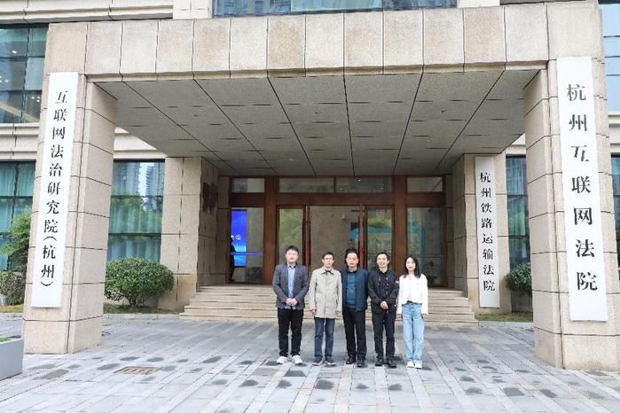 2023/04/27公共管理学院赴杭州互联网法院调研4月24日,公共管理学院公共政策系主任龚万松、知识产权本科专业负责人骆正言、青年教师许思琪、赵建浩一 -