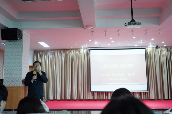 2023/04/27擦亮双眼 抵制诱惑 ——商学院组织开展安全教育讲座为提升大学生安全防范意识,增强自我保护能力,2023年4月26日下午,商学院邀请学校保卫处处长左克军 -