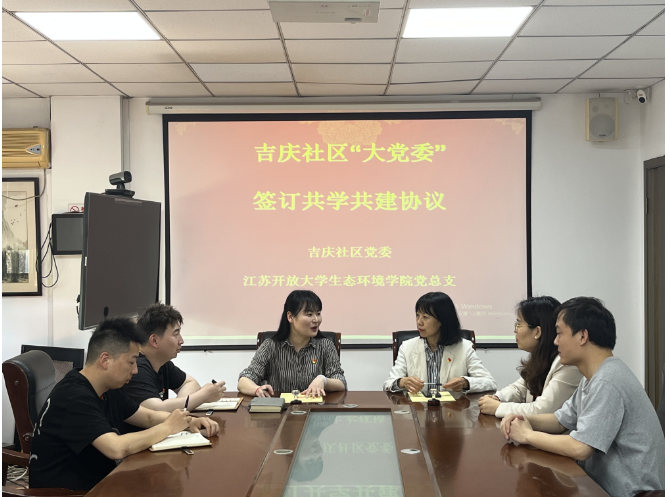 2023/04/27加强党建共建 共谋合作双赢—环境生态学院与建邺区吉庆社区党委开展党建共学共建为深化校地“共建组织、共享资源、共谋发展”新格局,4月24日,江苏开放大学环境生态学院党总支部与建邺 -