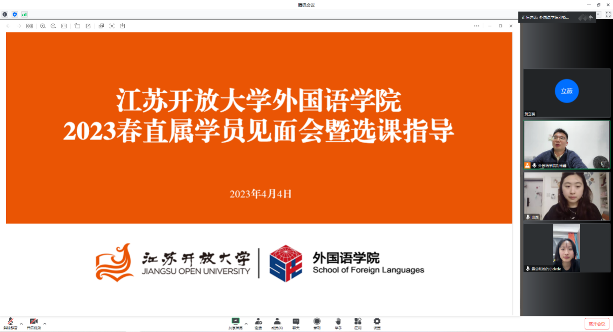 2023/04/06外国语学院召开2023春新生见面会暨选课指导4月4日晚,外国语学院召开了2023春学院新生见面会暨选课指导。本次会议由开放学员管理教师刘杨鑫主持 -