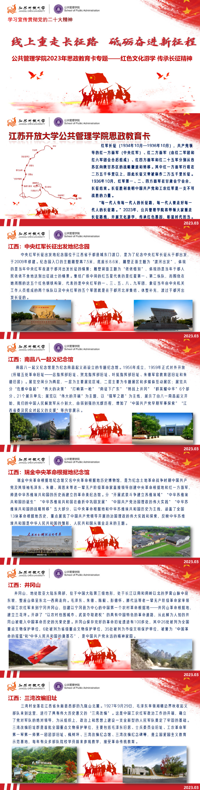 2023/03/31红色文化线上游学 传承弘扬长征精神 ——公共管理学院制作发放3月份思政教育卡和心理健康教育卡为了坚持常态化、长效化、个性化做好思想政治教育和心理健康教育协同育人,创新网络思政育人路径,推动育心