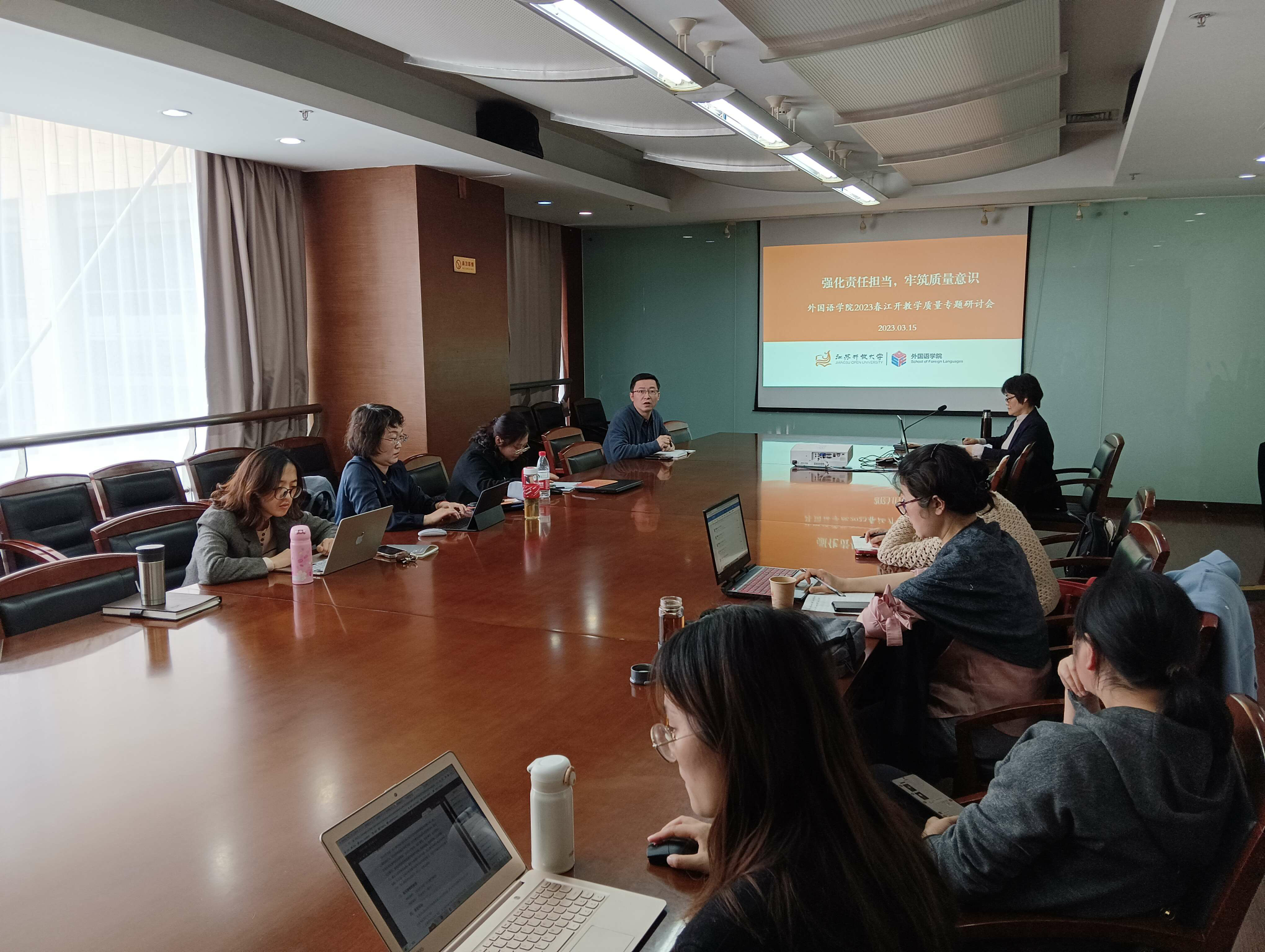 2023/03/16强化责任担当 牢筑质量意识——外国语学院召开2023春开放教学质量专题研讨会为进一步提升开放教学质量,3月15日下午,外国语学院在定淮门校区综合楼第三会议室开展了2023春学期 -
