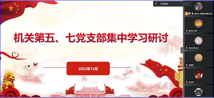 2023/01/04深学党章强党性,汲取力量共奋进——机关第五、七党支部开展集中学习研讨12月29日,机关第五党支部与机关第七党支部采用线上方式联合开展集中学习研讨,会议由机关第五支部书记 -