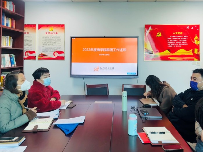 2023/01/05商学院组织开展2022年度群团工作述职1月4日上午,商学院在综合楼304组织开展2022年度群团工作述议。商学院党总支部委员,分工会、团总 -