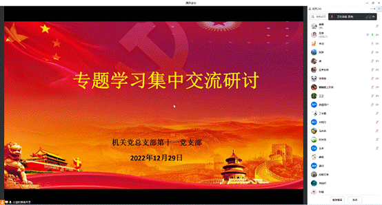 2023/01/03机关党总支部第十一党支部召开专题学习研讨会12月29日上午,机关党总支部第十一党支部采用线上方式开展专题学习研讨会,会议由党支部书记吕莹主持, -