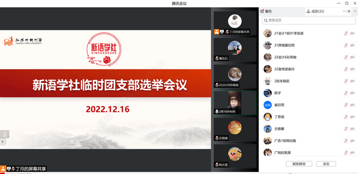 2022/12/23我校新语学社召开临时团支部选举会议为进一步加强学生社团组织建设,发挥团员的先锋模范作用,根据校团委相关要求,12月16日,新语学社以线 -