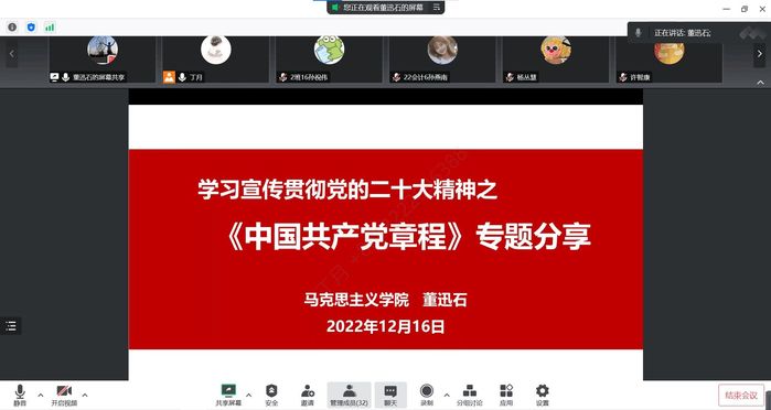 2022/12/23学习党章 奋进新征程——我校新语学社开展《中国共产党章程》线上学习讲座12月6日,我校新语学社开展党的二十大精神理论学习活动,专题学习《中国共产党章程》。社团指导老师马克 -