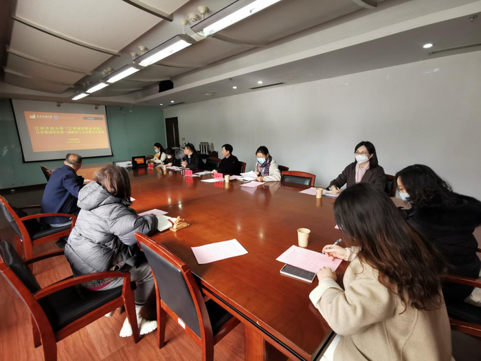 2022/12/15商学院召开课程建设委员会会议12月14日,商学院在定淮门东校区综合楼304室召开课程建设委员会工作会议,开展江开新开课程说课及评 -