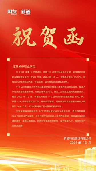 2022/12/09商学院在业财一体信息化证书(中级)1+X试点项目认证中取得优异成绩近日,商学院收到业财一体信息化证书(中级)1+X试点项目主办单位新道科技股份有限公司的祝贺函,祝贺我 -