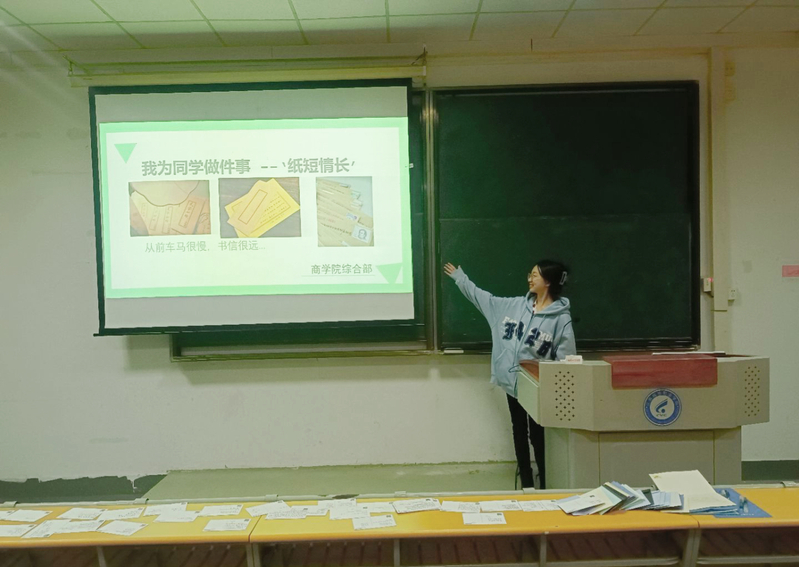 2022/11/30青葱岁月 书信同行 ——商学院开展“我为同学做件事——‘纸短情长’”活动为引导同学们在坦诚的思绪、平和的状态下与自己交流、与他人交流,用笔尖流露心底的深情,商学院学生会于2 -