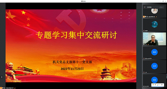 2022/11/28机关党总支部第十一党支部召开专题学习研讨会11月23日上午,机关党总支部第十一党支部采用线上线下相结合方式开展专题学习研讨会,会议由党支部书记 -