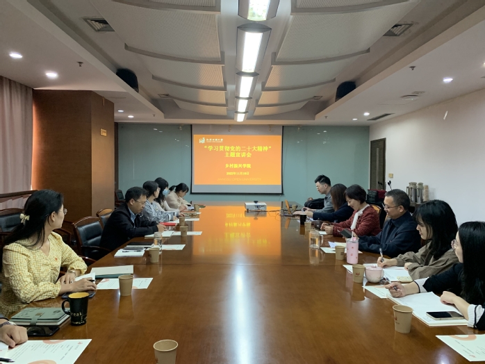 2022/11/14乡村振兴学院党总支部召开 “学习贯彻党的二十大精神”主题宣讲会为深入贯彻落实校党委关于认真学习宣传贯彻党的二十大精神的部署要求,在“全面学习、全面把握、全面落实” -