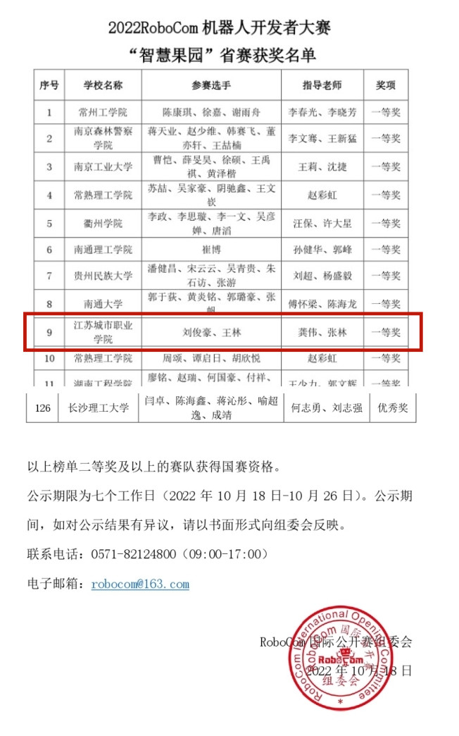 2022/11/03喜报:信息工程学院获“2022RoboCom机器人开发者大赛 智慧果园赛项”省级一等奖10月18日,由工业和信息化部人才交流中心、RoboCom国际公开赛组委会联合主办的“2022Rob -