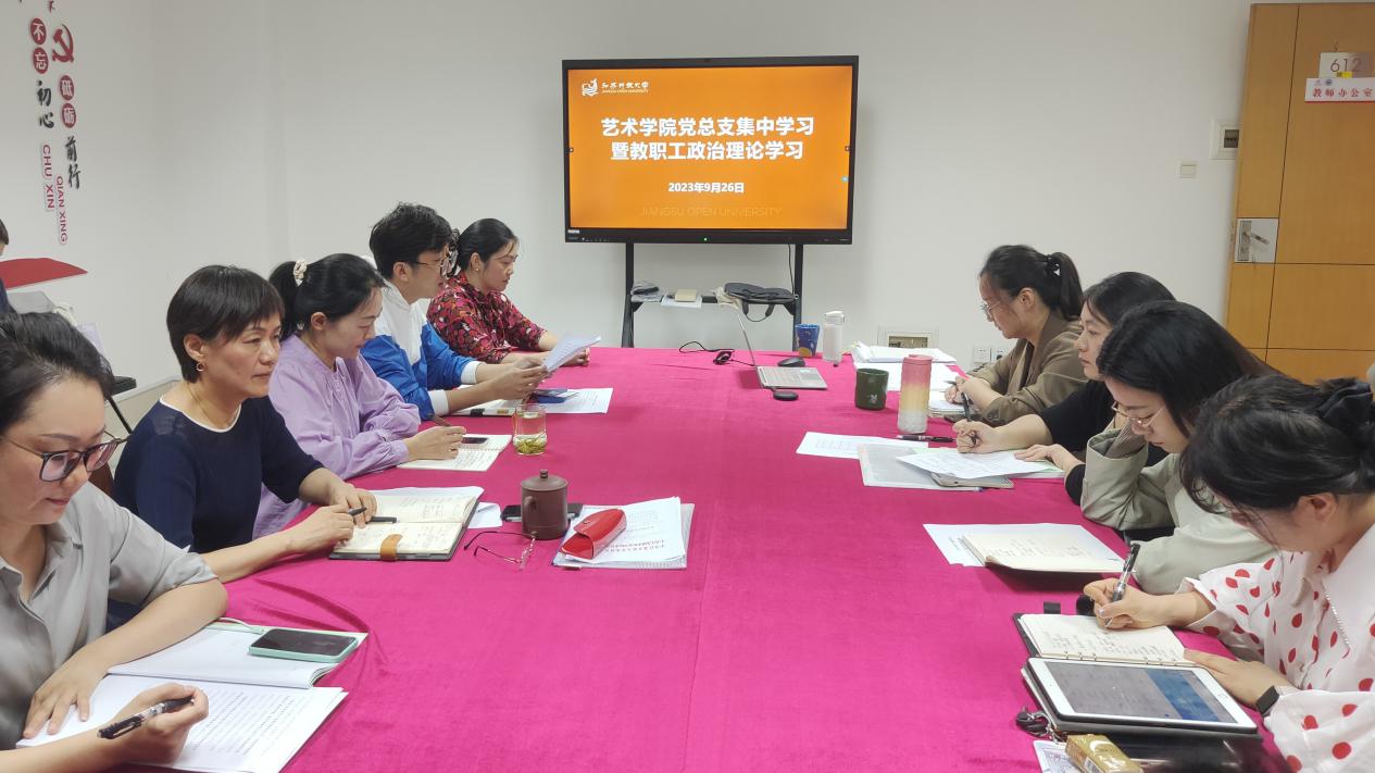 2023/09/27艺术学院党总支召开集中学习研讨暨教职工政治理论学习会议9月26日,艺术学院党总支在定淮门校区612室召开集中学习研讨暨教职工政治理论学习会议。本次学习专题是“深刻领悟‘两个确立’的决定性意义”,全体教职工参加了本次学习。会议由党总支书记丁姝娟主持。党总支副书记张洁首先围绕中央纪委国家监委公开通报的七起违反中央八项规定精神典型问题开展纪法教育,要求全体教师在中... -