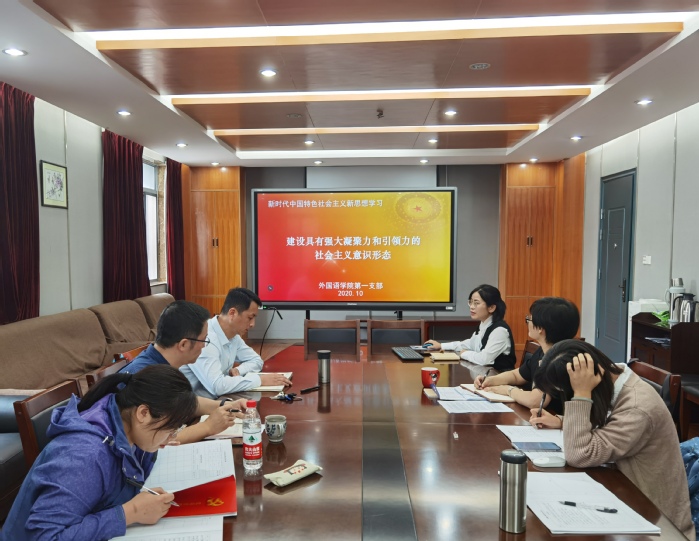 2020/10/16外国语学院第一党支部进行建设具有强大凝聚力和引领力的意识形态专题学习研讨活动为了深入学习习近平新时代中国特色社会主义思想,进一步树立“四个意识”,增强“四个自信”,切实把思想和 -