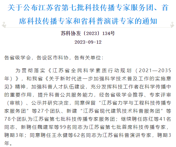 2023/09/15乡村振兴学院王琳被聘为江苏省第七批首席科技传播专家为贯彻落实《江苏省全民科学素质行动规划(2021—2035年)》和我省《关于新时代进一步加强科学技术普及工作的实施意见》精神,加强科普人才队伍建设,充分发挥科技工作者在科学传播中的重要作用,提升科普公共服务能力,近日,省科协公布了江苏省第七批科技传播专家服务团、首席科技传播专家和省科普演讲专家名单,我校乡村... -