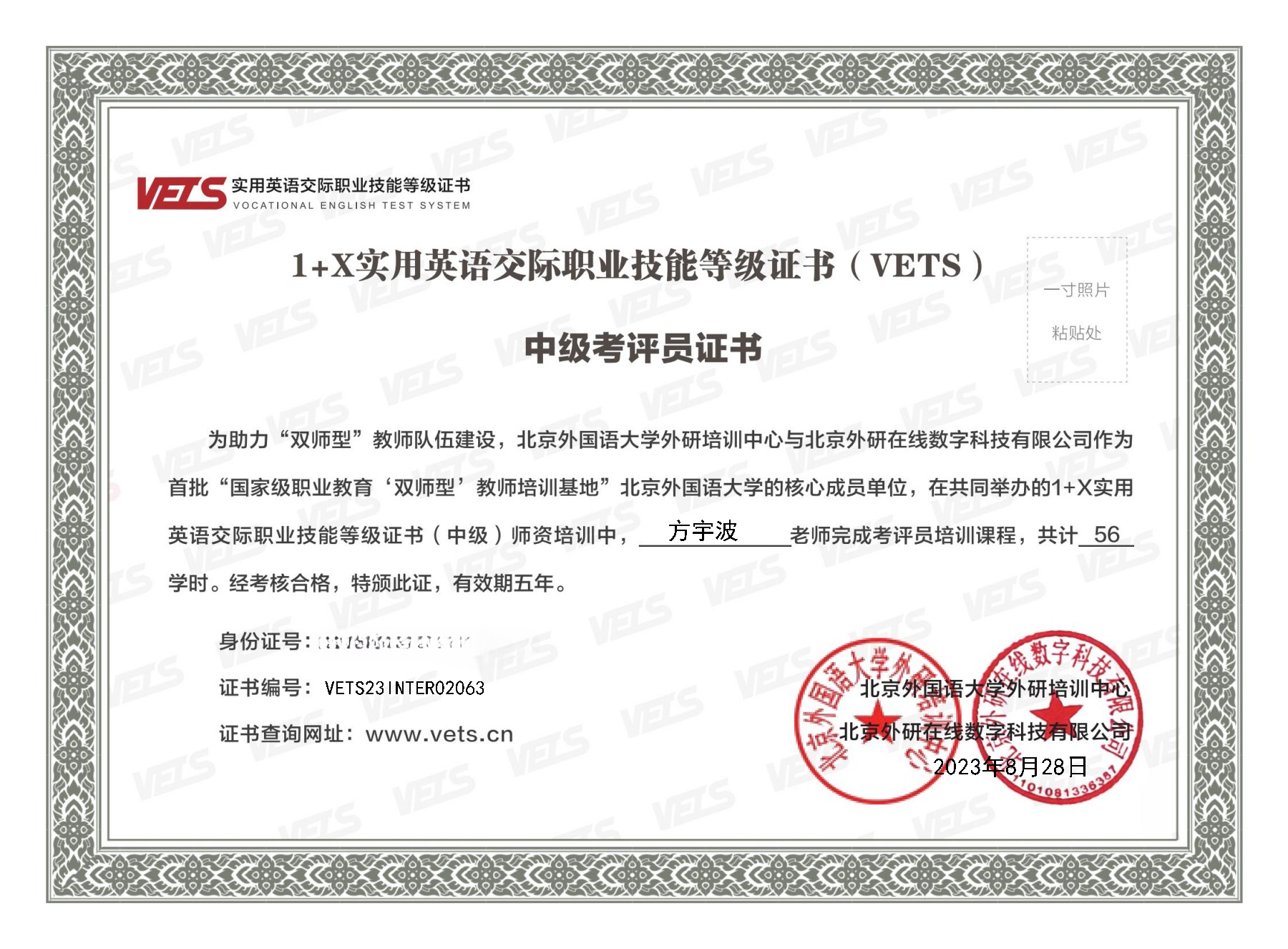 2023/09/15外国语学院组织教师参加“1+X实用英语交际职业技能等级证书(中级)”师资培训职业教育的高质量发展离不开高素质的教师队伍建设。为了进一步提升教师职业教育能力,外国语学院于8月22日至28日组织方宇波、伏伟两位老师赴哈尔滨参加了2023年“1+X实用英语交际职业技能等级证书(中级)师资培训班”。本次培训会中,由职教专家、外语教育专家、一线骨干教师组成的培训授课专家团队,分别从“政策解读、教... -