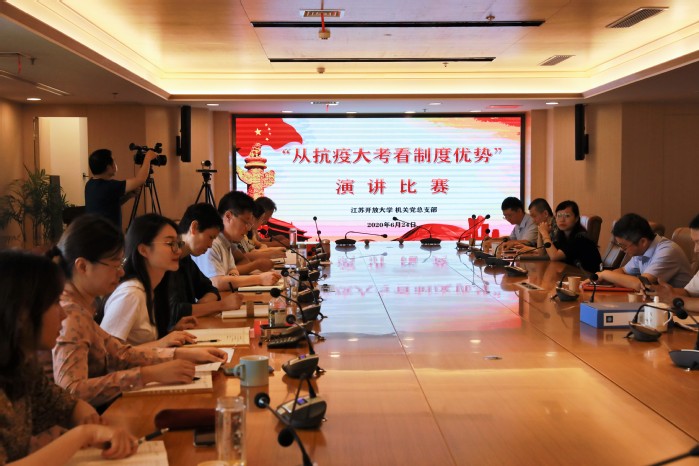 2020/06/28机关党总支部成功举办“从抗疫大考看制度优势”主题演讲比赛为深入学习宣传贯彻党的十九届四中全会精神,引导机关广大教职员工树牢“四个意识”,坚定“四个自信”,做 -