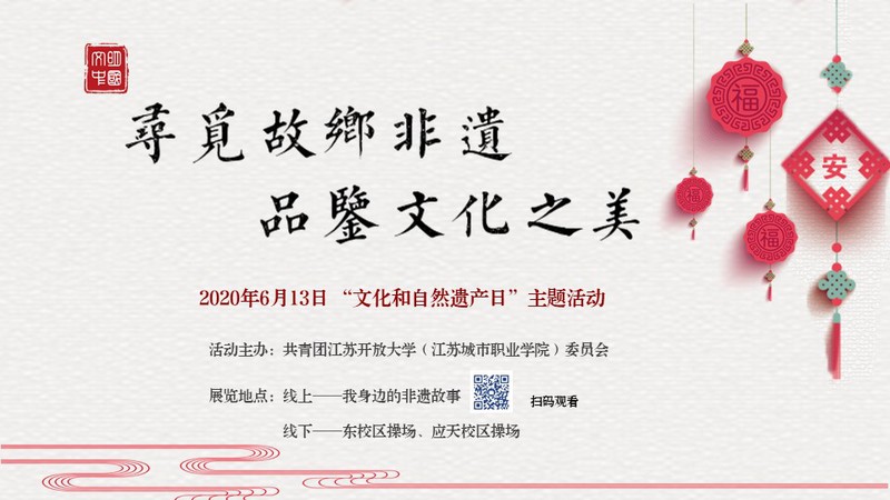 2020/06/19文化和自然遗产日——校团委举办“寻觅故乡非遗,品鉴文化之美”活动2020年6月13日是我国的“文化和自然遗产日”。文化和自然遗产日源自文化遗产日,定于每年6月的第二