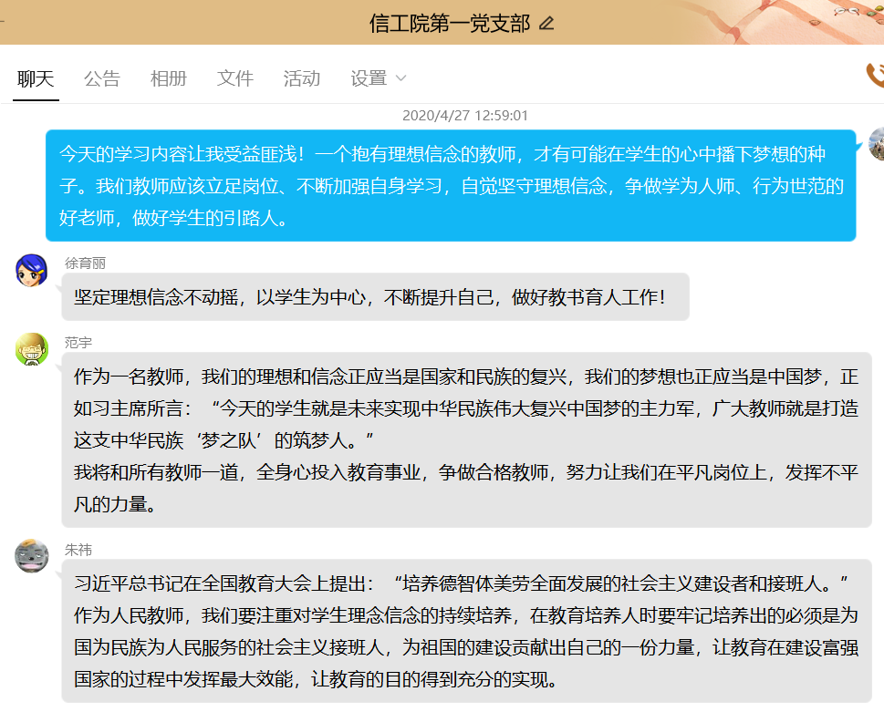 2020/04/29信工院第一党支部开展“坚定理想信念、做好本职工作”线上学习交流活动4月27日下午,信息工程学院第一党支部通过腾讯会议平台和QQ群,开展“坚定理想信念、做好本职工作”线 -