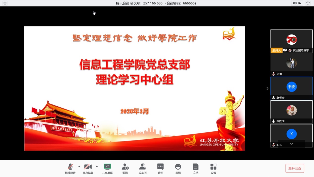 2020/04/01【信工战“疫”(二十四)】信工院党总支部理论学习中心组开展“坚定理想信念”专题学习3月30日,信息工程学院党总支部理论学习中心组通过“视频会议”的形式,开展了“坚定理想信念 做好学院 -