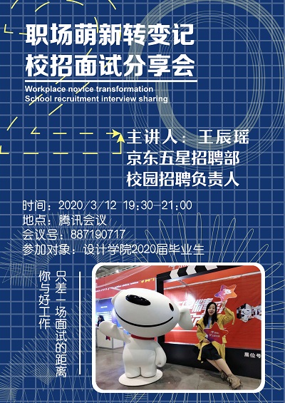 2020/03/13设计学院举办线上校招面试分享会3月12日,设计学院举办“职场萌新转变记”线上校招面试分享会”,邀请了京东五星招聘部校园招聘负责人王 -