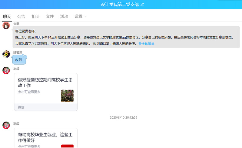 2020/03/13“做学生的良师益友”——设计学院第二党支部开展网上主题党日活动(一)为进一步做好新型冠状病毒感染的肺炎疫情防控工作,坚决贯彻落实党中央和省委决策部署,积极响应学校党委组 -