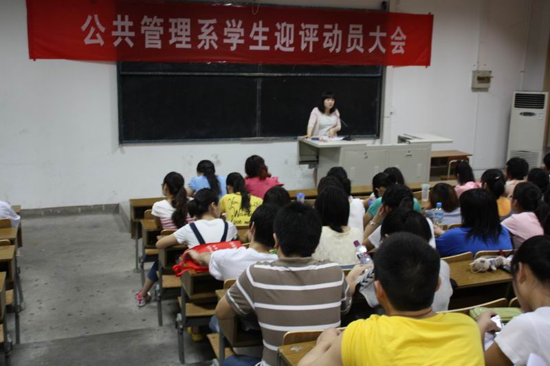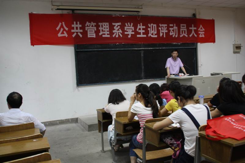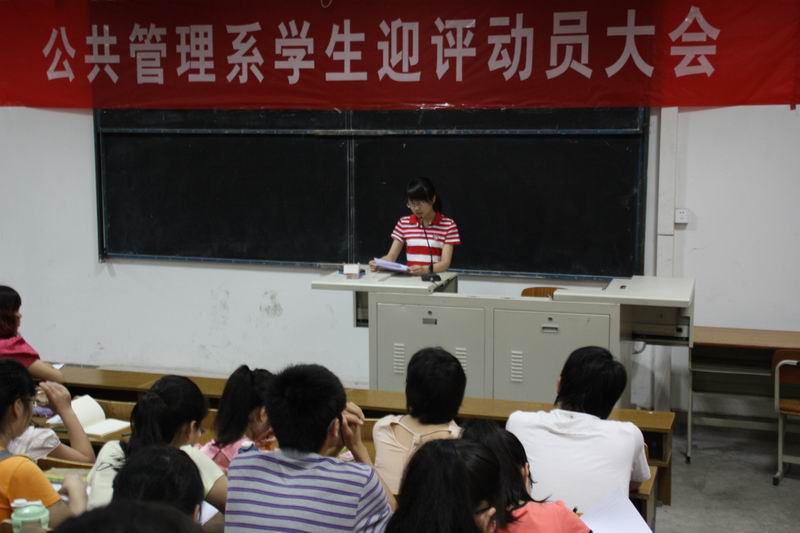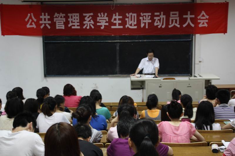 2011年6月10日上午,公共管理系在教学楼一楼南阶梯教室召开迎评学生动员大会。系主任卢福毅出席大会并讲话,系党总支副书记纪河、团总支副书记、辅导员、08法学班全体学生以及毕业班学生代表参加了会议。会议由纪河主持。