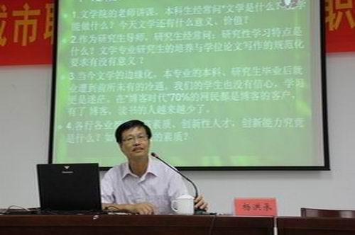 系列讲座一——《漫谈文学与素质教育、创新能力的培养》,本次讲座由南京师范大学文学院副院长、博士生导师、江苏省现代文学协会副会长兼秘书长、江苏省鲁迅研究会副会长杨洪承教授主讲。杨教授开场就从“漫谈话题的缘起”出发,通过列举众多鲜明的例子来探讨“文学与素质、创新意识的关系”、“文学审美与精神信仰及素质培养的建构”等问题,最后得出“阅读文学经典与人的素质旨归”的结论。