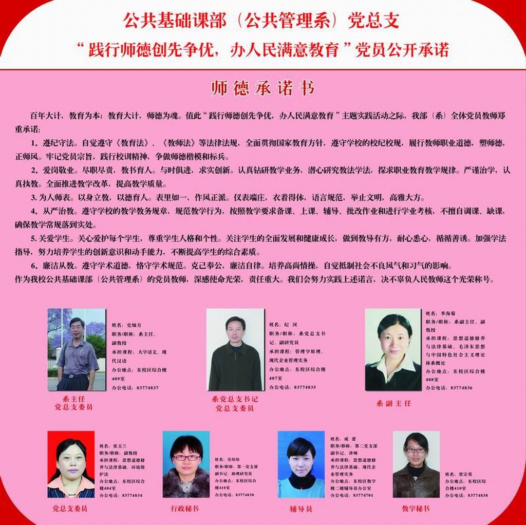 公共基础课部(公共管理系)党总支“践行师德创先争优,办人民满意教育”党员公开承诺公示