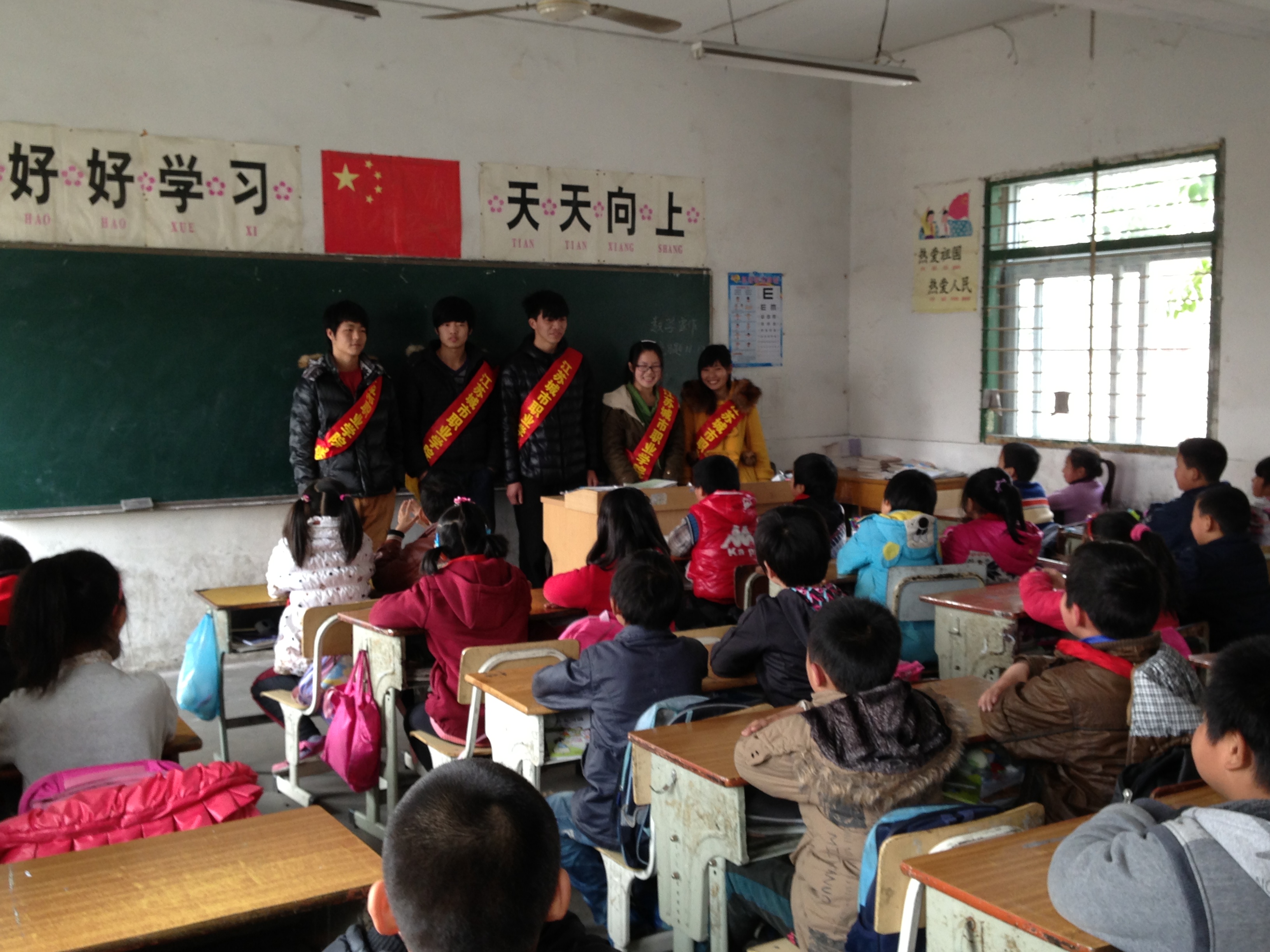 本次实践活动由学生自主设计,内容是开展品德课和体育课教学活动,对象是三年级和四年级的同学,时间为两个小时。在校长邓衍行和教务主任左孝爽的全面介绍和注意事项后,同学们分成两个组开展活动。品德课教学组,组长包慧云同学发动全体组员精心设计,进行了三大版块的教学:首先是“脑筋急转弯”,旨在活跃气氛,拉近与孩子们的距离;其次是小组成员给孩子们表演节目,让孩子们跟着学习;再次是讲一些关于团结同学、尊敬师长、报答父母的小故事,让孩子们感悟故事的意蕴。体育课教学组,在组长关颖同学的带领下,充分调动组员和小学生们的积极性,进行了反口令练习,通过这项练习,迅速融入课堂;随后还开展了羽毛球、足球、跳皮筋等活动,中间还进行了海盗船长的游戏,整个教学过程生动活泼,孩子们脸上绽放出阳光笑容。14位同学不仅带去了精神食粮,还向学校捐助了学习和体育用品。