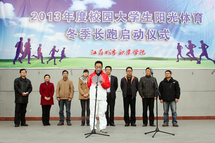 财经系13级会计班李启明同学代表全体同学宣读了积极参与冬季长跑活动的倡议书。他倡议全院学生一起积极投入校园阳光体育冬季长跑活动中来,每天一小时,长跑不间断。做阳光少年,展自我风采。在操场上,在大自然中,让运动成为习惯,让青春更加精彩。