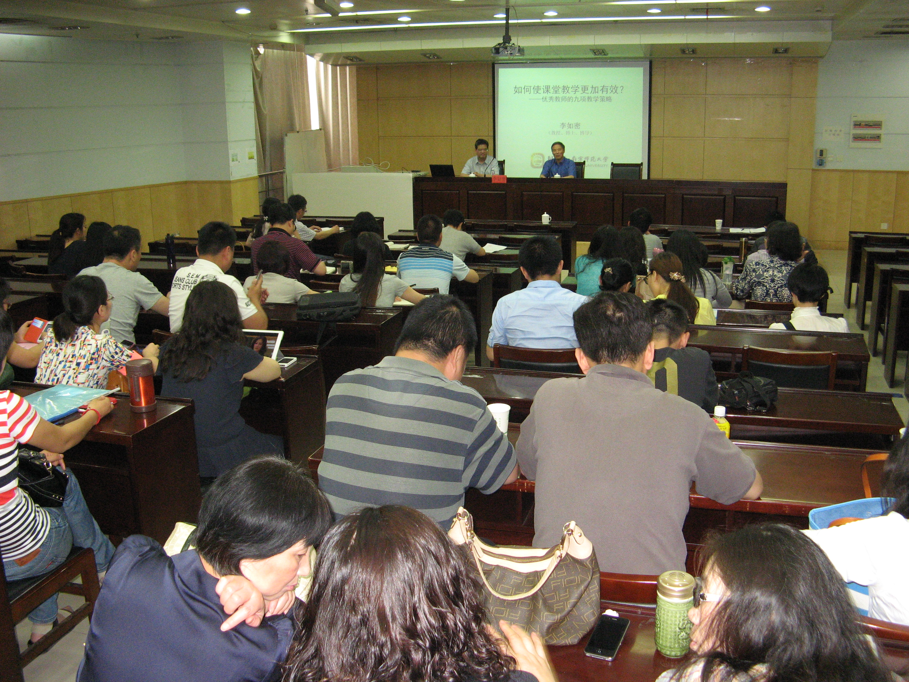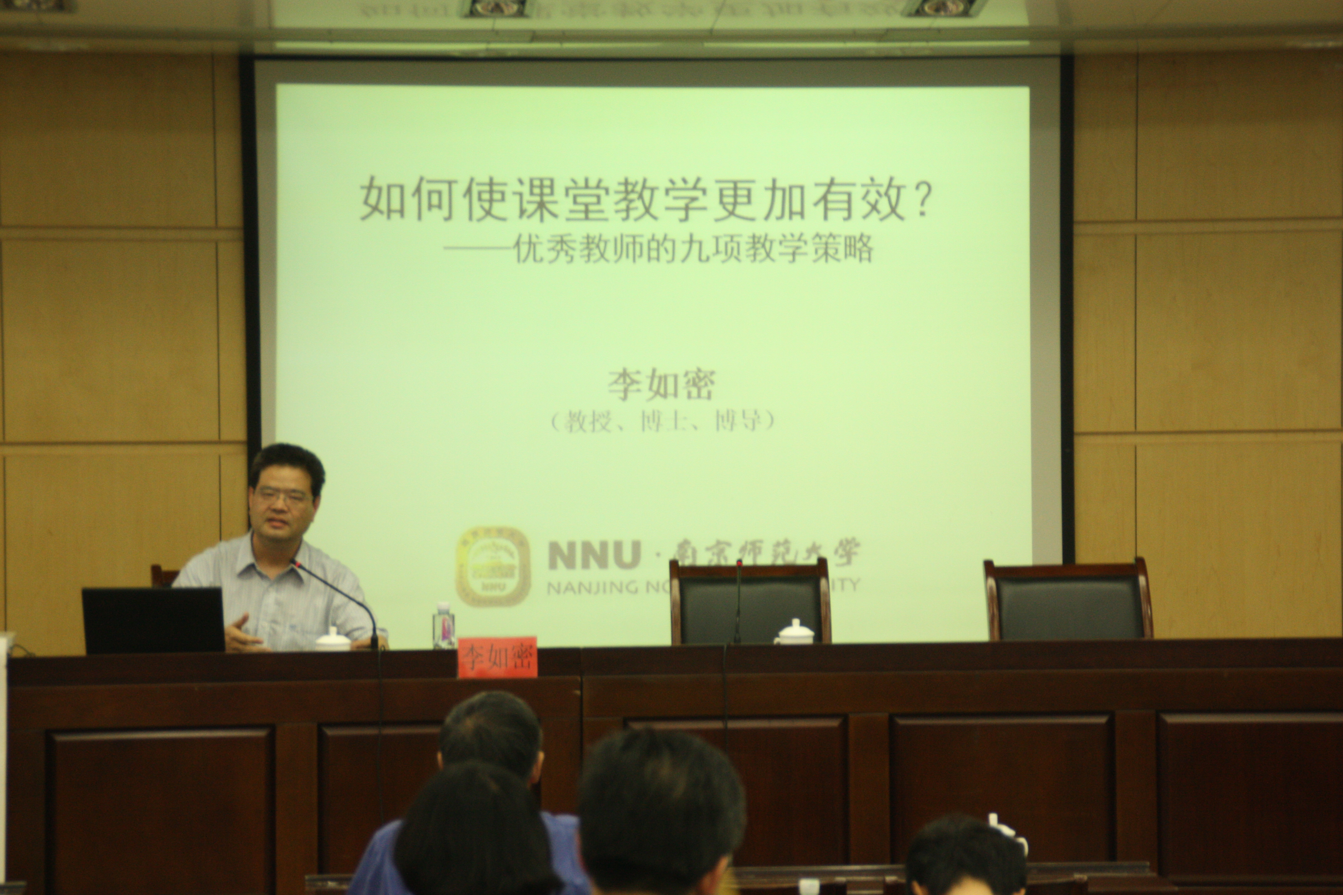 李如密教授教态儒雅,教风质朴,引经据典,别有韵致。下午的讲座,他以自身教学经历中的一堂“脱稿授课”的案例谈起,介绍了成就“与众不同”的优秀教师所必备的九项教学策略(寻准契合点;目标导向;多样化呈现;时间运筹;讲求细节;妥善处理课堂问题;课堂组织结构艺术;教学语言;有针对性指导)。李教授善于引述古今中外教育理论,结合当下学校课堂教学实践,理实相辅,深入浅出,为大家呈现了有效教学的鲜活示例,使在座聆听者深受启迪,受益良多。