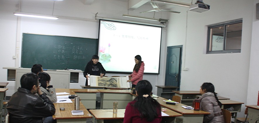 尹星老师以“天价拍卖美术作品”作导入,赏析了中国山水画的画风画技和魅力所在。她从中国画与西洋画的画种对比中凸显了中国山水画的独特之处,从笔墨、写形、构图、意境、题词等方面,生动形象地讲解了中国山水画欣赏方法,并展示了《富春山居图》的印刷画卷,现场点评作品的焦、浓、重、淡、清的墨色特点与留白艺术等。作品解读思路清晰,重点突出,引人入胜,紧紧吸引住听课者的注意力,取得了良好的教学效果。