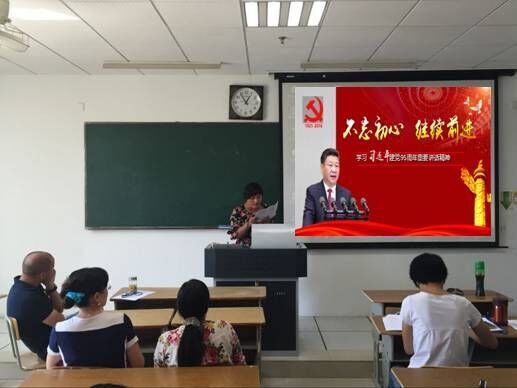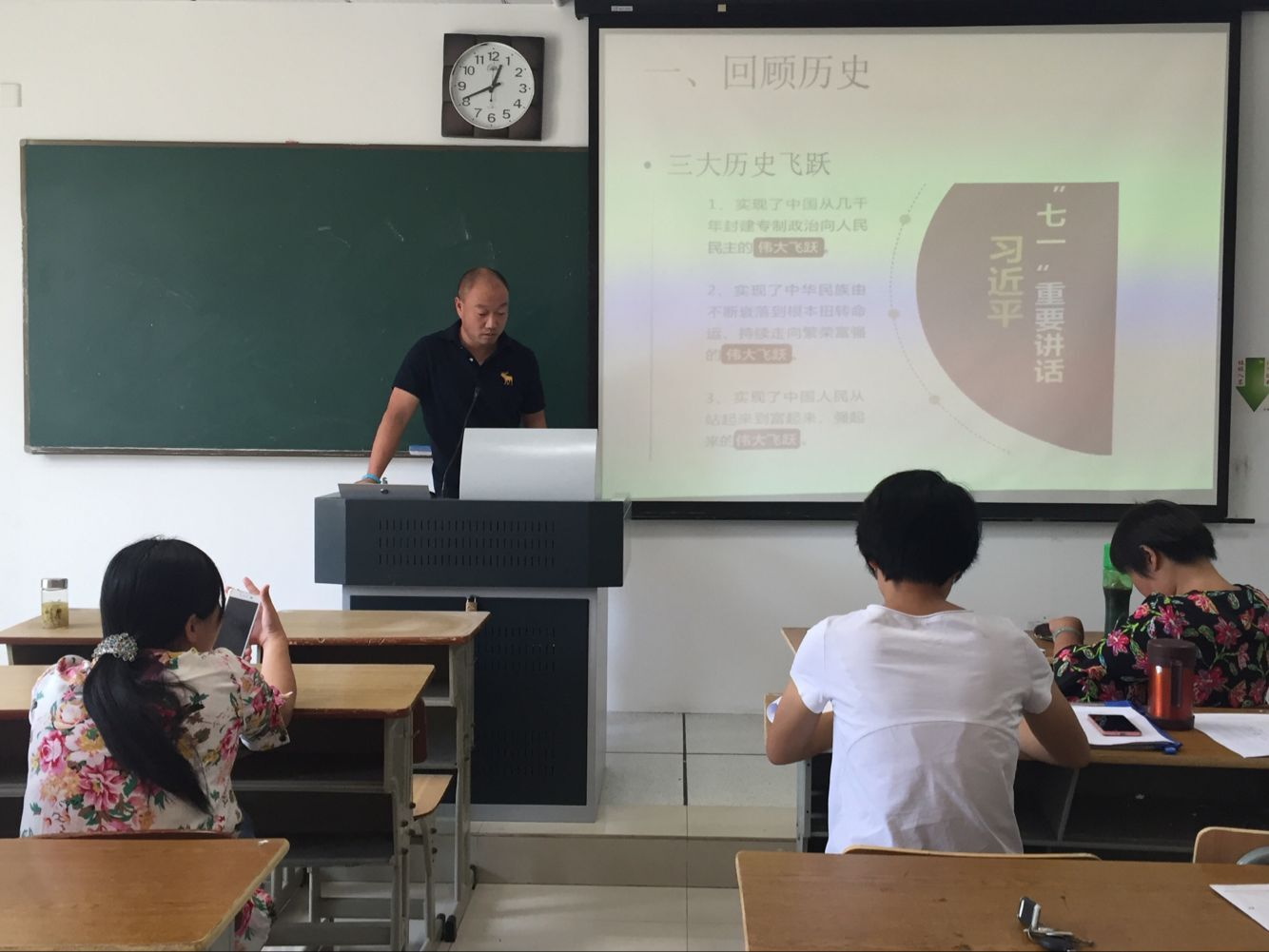 何康老师从“回顾历史”、“不忘初心”、“从严治党”、“两岸关系”、“国际合作”、“信心满怀”六个方面,带领党员们再一次系统地梳理了“七一”重要讲话的内容。张洁老师以“不忘初心,继续前行”为主题,从党的历史贡献、历史经验、历史对现实的启迪等方面,分析强调了成功离不开先进的理论指导,我们党的发展事业,战略是正确的,我们要坚持马克思主义指导思想,牢记共产主义理想信念,坚定“四个自信”,我们一定能实现中华民族伟大复兴中国梦。