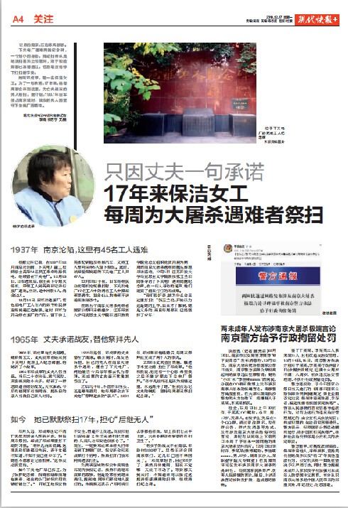 张玉兰教授向参加国家公祭日悼念活动的现场记者介绍了邓成翠及其事迹,邓成翠的感人事迹不仅打动了我校师生,也打动了《现代快报》记者。12月17日,《现代快报》A4版刊登了邓成翠女士的事迹。