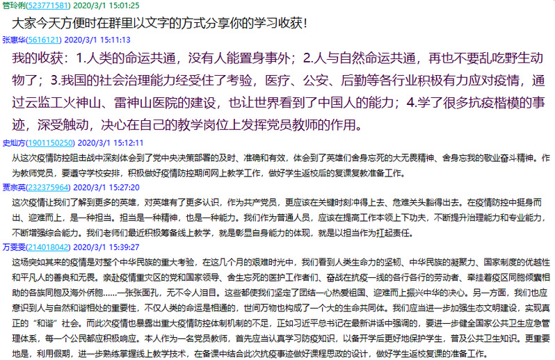 第二阶段,支部全体“思”;支部在“学习强国”平台,以视频会议的方式,组织党员分享学习收获。每位党员结合近期的工作,分享了学习感悟,纷纷表示,开学在即,要把习近平总书记的重要讲话精神落实到自身工作实际中,学习战“疫”英雄的担当精神,用实际行动践行初心使命。同时,每位党员在视频会议后,还在支部QQ群以文字的方式留下了自己的学习收获。