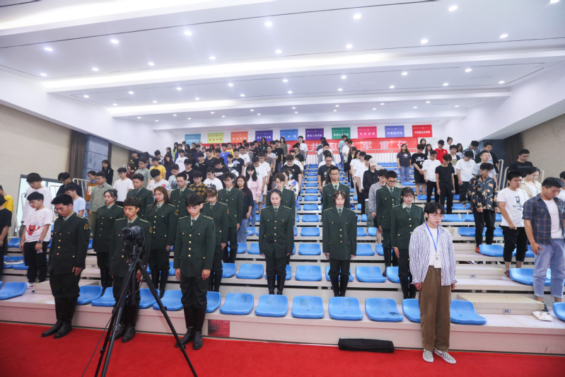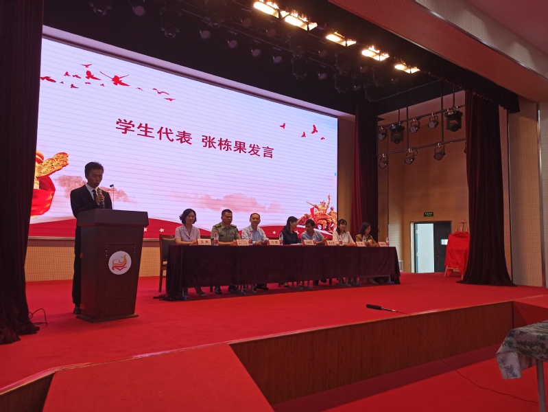 学生代表张栋果倡议同学们树立国防意识,学习国防知识,增强国防本领,用实际行动弘扬青春正能量。