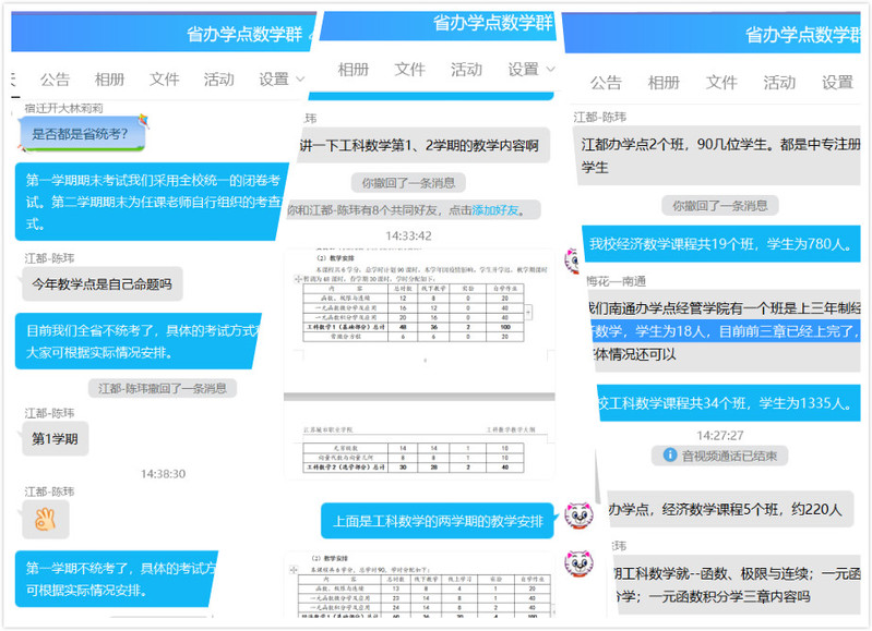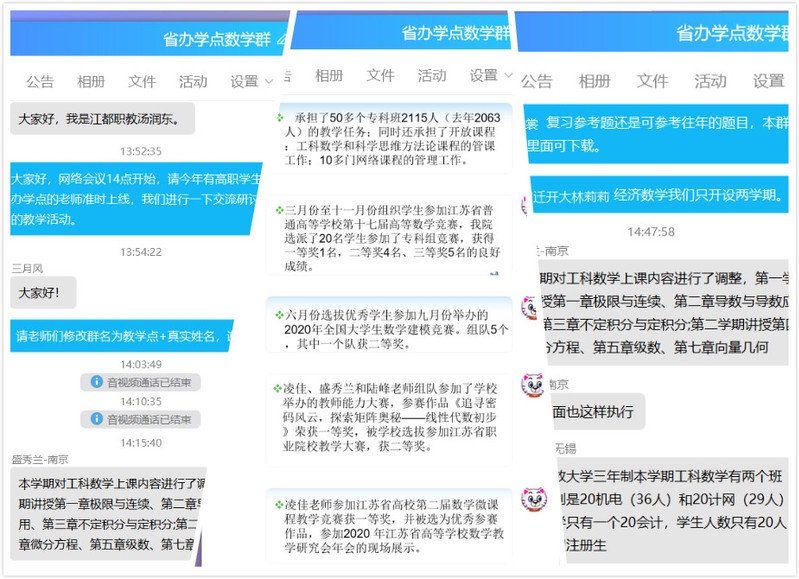 2020年12月16日,江苏城市职业学院2020年度三年制高职数学课程网上教学研讨会通过工科数学与经济QQ群召开。来自全省四个办学点的数学骨干教师及教育学院科学素养部数学教师共15人参加了会议。会议由科学素养部主任陆峰主持。
