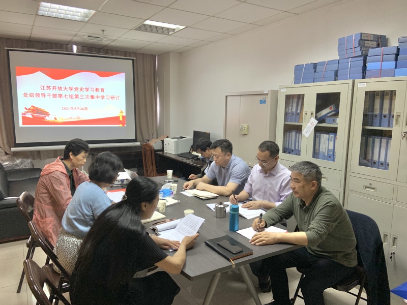 5月26日,江苏开放大学党史学习教育处级领导干部第七组第三次集中学习研讨会在定淮门校区1402室召开。本次研讨以“社会主义革命和建设时期历史”及“党在江苏的奋斗史”为主题展开。第七组成员参加学习研讨。会议由第七组组长、教育学院党总支部书记俞金元主持。