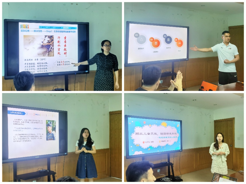 夏松老师以《学前教育学与课程思政》为题,在课前思政、设计思路、教学案例、未来计划四个方面讲述了学前教育与思政教育间的重要联系。凌佳老师《矩阵运算的应用——基于Hill密码的加密和解密技术》以经典红色电影引入主题讨论,讲授期间以数学中的实际应用、古诗引用、国家科技发展成就宣传等手段挖掘课程思政元素,充实数学课程思政教学。顾春花老师《禾下乘凉梦,十里稻花香——电影<袁隆平>的人物塑造》通过重难点、教学内容的介绍、讲解与引导,以袁隆平科学探索精神激发学生爱国爱民奋进情怀。张成老师《体育课程思政汇报——以网球选修课为例》强调价值观与体育课程各环节的紧密结合。赵建华老师《篮球课——体育课程思政》提出了篮球课四种思政元素需贯彻到体育课程之中。王洁老师《多个事件的相关独立性》以病毒感染概率为例进行了一场生动的课程思政展示课。周游老师《解放儿童天性,回归游戏本质——传统游戏与幼儿教育》强调游戏中民族文化元素以及游戏所体现出的文化价值。万雯雯老师以《江苏运河城市文化特点与保护传承》为题,讲述了大运河与江苏城市文化间的紧密联系,凝练出大运河所体现出的民族文化精神,挖掘课程中所蕴含的思政元素。
