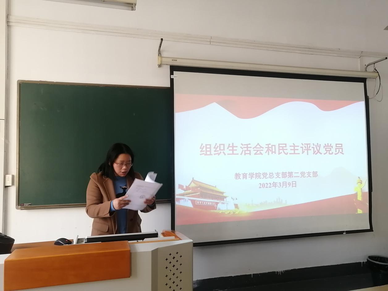 根据学校党委《关于召开2021年度组织生活会和开展民主评议党员的通知》要求,教育学院党总支部第二支部于3月9日下午在定淮门东校区103教室召开组织生活会和民主评议党员大会,会议由支部书记管玲俐主持。