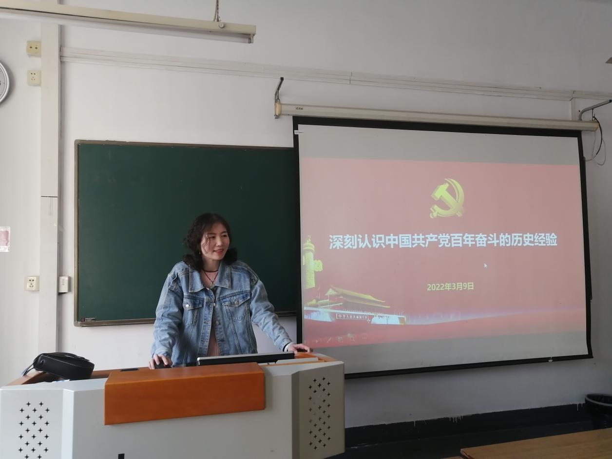 会前,党员教师范雨静为支部党员同志们上党课。党课主题为《深刻认识中国共产党百年奋斗的历史经验》。范雨静老师结合自身教学、科研、实践活动等,理论联系实践,为支部同志们生动讲解自己对于中国共产党百年奋斗的历史经验的深刻认识。