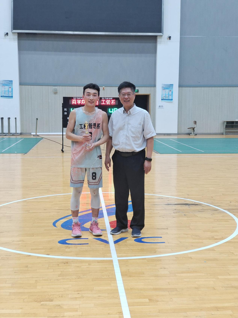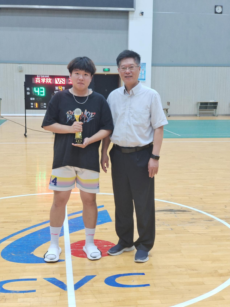 在中场休息时,特设了女子3V3的比赛和三分球决赛。最终建筑工程学院工程管理系队获得6分,以一分优势险胜商学院队。在师生互动的三分球大赛中,教务处李苏老师和环境生态学院的王新典老师作为教师代表,与八位同学同场竞技,最终“三分王”被信息工程学院电子工程系陶雨同学收入囊中。